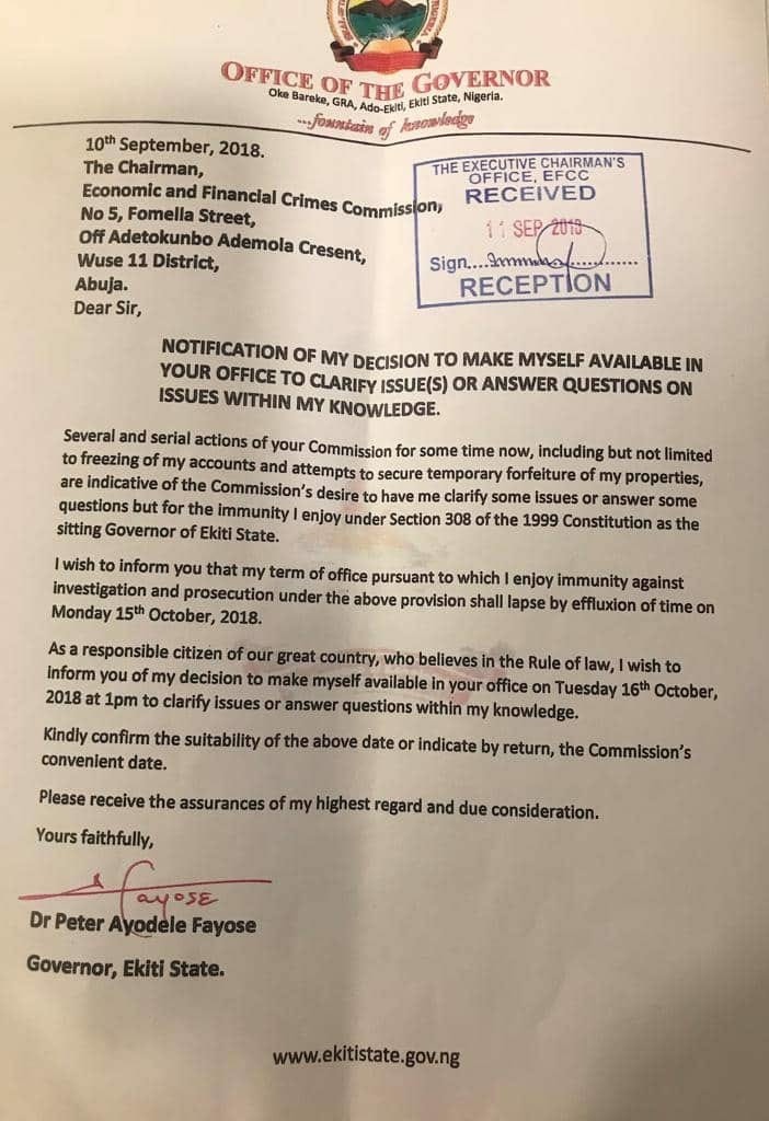 EKITI State governor Ayo Fayose has written to the Economic and Financial Crimes Commission (EFCC) offering to submit himself for questioning when he leave office on October 16 and his immunity from prosecution expires.