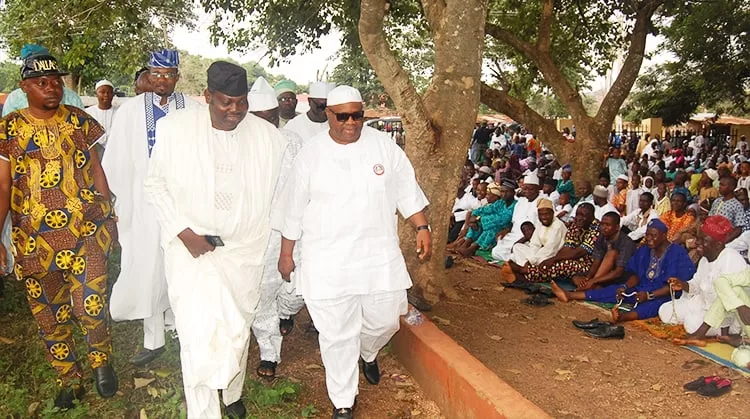 GOVERNOR Ademola Adeleke of Osun State was caught up in a spat at the Oshogbo prayer ground today after he and former senate spokesman Senator Ajibola Basiru had an altercation over seating arrangements.