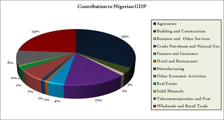 [1] Here is a pie chart, which offers a breakdown of the Nigerian economy into its component sectors. As you can see, manufacturing only accounts for about 7% of gross domestic product (GDP). This for me is at the root of all our problems