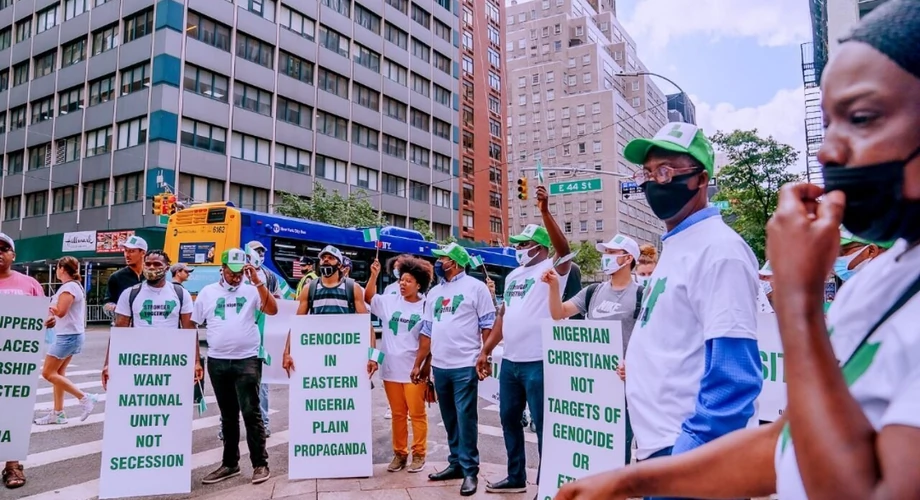 NIGERIAN self-determination groups organising protests outside the United Nations General Assembly in New York have accused the federal government of recruiting foreign mercenaries to hold rival demonstrations in support of the Buhari administration.